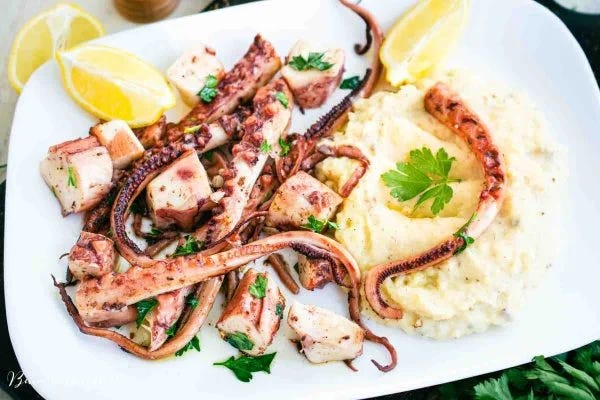 Tentacule de calamar la tigaie - servite cu piure de cartofi cu ciuperci uscate. E un meniu “copiat” aproape 1:1 dupa ce am mâncat ceva similar la un restaurant din Galați și am fost nemulțumită de cantitatea de trufe din piure. Așa că am căutat trufe uscate pe la supermarketurile din oraș. Nu am găsit decât ciuperci uscate, dar am făcut o treabă foarte bună cu ele. În orice caz, mai bună decât restaurantul 😅