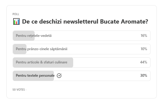 În ediția trecută am făcut un mic sondaj și m-a bucurat răspunsul vostru: cei mai mulți deschideți newsletterul pentru articole și sfaturi culinare (44%), dar și pentru textele personale (30%). Exact combinația dintre util și poveste. Asta înseamnă că ceea ce îmi place mie cel mai mult – să vă povestesc și să vă dau idei practice – e și ce apreciați voi cel mai tare. Perfect match! ✨